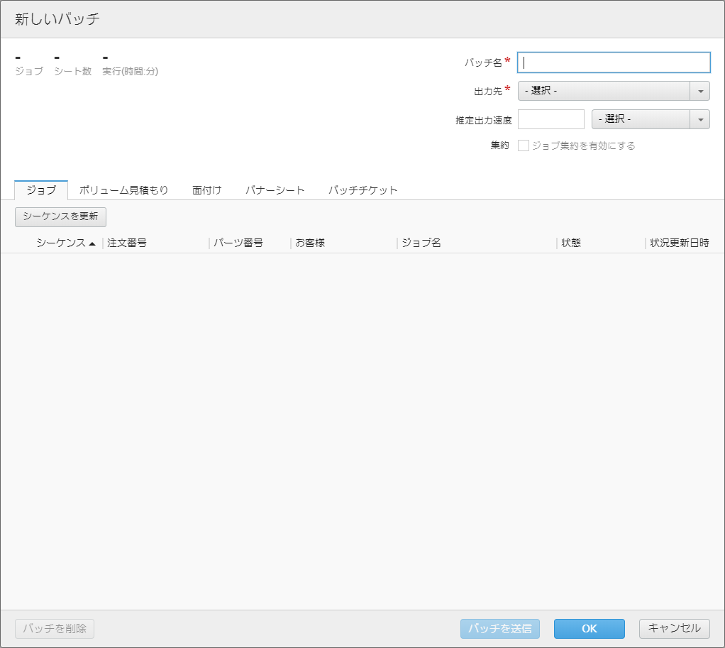バッチ名を入力し、メニューから 出力先を選択してから、各ジョブの部数を入力します。